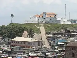 Im 18. Jahrhundert begann die Stadt sich auf die nördliche Halbinsel auszudehnen, auf der sich die Conraadsburg befindet. Bereits im 17. Jahrhundert war eine Zugbrücke über die Lagune gebaut worden, die die allmähliche Besiedelung förderte und Zugang zu den unterhalb der Conraadsburg gelegenen Gärten der Westindischen Kompanie verschaffte. Die Zugbrücke war mit Wachthäusern an beiden Enden versehen, um fremden Afrikanern den Zugang in die Stadt zu verwehren.[44] Für die erste Hälfte des 18. Jahrhunderts schätzt Feinberg die Einwohnerzahl Elminas auf etwa 12.000–16.000 Menschen.[45]
