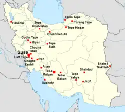 Bereits in der Jungsteinzeit (Neolithikum) wurde das Land, das heute als Iran bezeichnet wird, besiedelt, bzw. es sind Siedlungsspuren nachweisbar. Dauersiedlungen und Nahrungsmittelerzeugung sind etwa durch bemalte Keramik und kleine Tonfiguren für das jüngere Neolithikum (6500–5550 v. Chr.) nachweisbar.[1] In der ehemaligen Provinz Chusistan liegen die kraft kalibrierter 14C-Datierungen auf eine Besiedlungsgeschichte ab dem 8. Jahrtausend v. Chr. reichenden Tschogha Bonut sowie Tschogha Misch. Im 4. Jahrtausend v. Chr. gab es eine erste Wanderbewegung von Indogermanen, die zusammen mit den Indern die Bezeichnung Arier (ariyānām) haben. Die Herkunft dieser Arier ist umstritten, man ist sich aber darüber einig, dass sie aus dem Norden stammen. Bereits gegen Ende des 4. Jahrtausend v. Chr. kann von einer städtischen Zivilisation gesprochen werden, die sich aus der Ackerbau betreibenden, sesshaften Bevölkerung entwickelte.[2]
