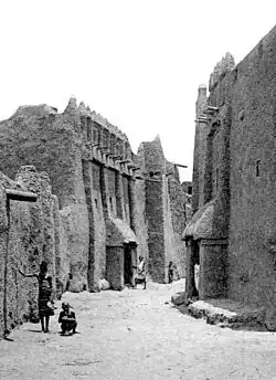 Die ältesten Funde im 1974 bis 1998 ausgegrabenen Djenne-Djeno (auch Jenné-Jeno) im Binnendelta wurden auf etwa 250 v. Chr. datiert und belegen damit die Existenz einer differenzierten Stadtkultur aus eigener Wurzel. In Djenne-Djeno, wie im gesamten Binnendelta, wurde Eisen und Kupfer bereits ab dem ersten Jahrtausend v. Chr. verarbeitet. Dabei lag das nächste Eisenerzlager bei Bénédougou, rund 75 km südwestlich von Djenne-Djeno.[34] Zwei römische oder hellenistische Perlen weisen auf transsaharischen Handel hin, doch sind vom Mittelmeer ansonsten keinerlei Einflüsse erkennbar, so dass man beim Handel und Tausch wohl mit zahlreichen Zwischenhändlern rechnen muss. Um 450 hatte die Stadt bereits eine Fläche von 25 ha erreicht und wuchs bis um 850 auf 33 ha an.[35] Dabei war sie von einer 3,6 km langen Mauer umgeben. Die Häuser bestanden überwiegend aus zylindrischen, sonnengebrannten Ziegeln, die bis in die 1930er Jahre in Gebrauch waren. Zugleich wurde, wenn auch in geringerem Ausmaß, bereits mit rechteckigen Ziegeln gebaut.