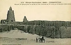 Doch gegen seine Art der politischen und religiösen Dominanz wandte sich ein Zweig eines in Marokko entstandenen Sufi-Ordens. Sein wichtigster Verfechter, ʿUmar Tall, geboren um 1797 im südlichen Senegal, entstammte einer arabisch gebildeten Familie. 1820 ging er auf Pilgerreise nach Mekka und kehrte mit einem Mandat zur Gründung eines Kalifats für die Tidschaniya-Sufis zurück. Der Herrscher von Sokoto gab ihm zwei seiner Töchter zu Frauen. 1850 gründete er, inzwischen El Hadsch Omar genannt, einen eigenen Staat in Dingiraye. 1851 begann er einen Dschihad gegen nicht-muslimische und muslimische Nachbarn, die er für „heidnisch“ hielt. Er überfiel in den frühen 1850er Jahren das Königreich Kaarta, erzwang dessen Konversion zum Islam und ließ 1854 in der Hauptstadt Nioro eine große Moschee erbauen. In den 1920er Jahren wurde Nioro zum Zentrum der Hamālīya, eines Zweigordens der Tidschānīya, der schnell als häretisch angesehen wurde.[63] 1936 änderten die Anhänger des Ordens ihre Qibla und beteten fortan Richtung Nioro, das sie ihr Mekka nannten.[64] 1854 wandte sich ʿUmar Tall gegen die französische Senegal-Kolonie, doch scheiterte er 1857 an der Festung Medina. 1861 wandte sich ʿUmar Tall Richtung Ségou, in das er am 10. März 1861 einzog. 1861 eroberte er das islamische Fouta Toro am Unterlauf des Senegal und besetzte am 16. März 1862 Hamdullahi, die Hauptstadt des Reichs von Massina im Nigerbinnendelta, das vom Qādirīya-Orden geprägt war, den der Eroberer der „Apostasie“ bezichtigte. Dessen Fulbe-Herrscher hatte sich zudem zum Amīr al-Mu'minīn (Beherrscher der Gläubigen) ausgerufen.