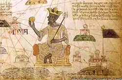Das neue Reich mit der Hauptstadt Niani erreichte unter Mansa Musa (1307/1312–1337) seine größte Flächenausdehnung, als es sich vom Atlantik bis an die Grenze des heutigen Nigeria erstreckte.[52] Mansa Musa beherrschte Timbuktu und Gao, dehnte seine Macht bis ins südost-mauretanische Walata und nach Taghaza aus, das 800 km nördlich von Timbuktu lag. Damit gewann er die Kontrolle über das dort gewonnene Salz, aber auch über den Handel mit dem südmarokkanischen Sidschilmassa. Im Osten wurden die dortigen Hausa unterworfen, im Westen griffen seine Armeen Takrur und die Länder der Fulbe und Tukulor an. Zu dieser Zeit erreichte der Transsaharahandel seinen Höhepunkt, die Händler Malis wurden als Dyula oder Wangara bekannt. Mansa Musa schickte Gesandte nach Marokko und nach Ägypten. Das Reich unter Mansa Musa war derart wohlhabend, dass, als dieser Herrscher auf einer Pilgerfahrt nach Mekka durch Ägypten kam, dort die Währung – der auf Gold basierte ägyptische Dinar – aufgrund seiner großzügigen Goldgeschenke auf Jahre hinaus zusammenbrach.[53] Musa brachte vielleicht zehn Tonnen Gold auf den Markt, so dass in Venedig, der Drehscheibe von Gold- und Silberhandel, die Wertrelation der beiden Edelmetalle schlagartig von 1 zu 20 (1340) auf 1 zu 11 (1342), bis 1350 schließlich auf 1 zu 9,4 einbrach. Der Wert des Goldes im Verhältnis zum Silber fiel, bis, wohl in den 1370er Jahren, ein vollständiges Abreißen der Goldkarawanen den Zustrom beendete. Der Tod Sulaymans (Mansa Musas Bruder und Nachfolger) und die folgenden Auseinandersetzungen führten zum Zerfall des Reiches und brachten das komplizierte transsaharische (Gold-)Handelsnetz zum Zusammenbruch.