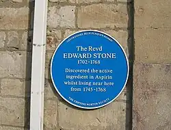 Der wichtigste Wendepunkt für Salicylat-Medikamente kam im Jahr 1763, als ein Brief des englischen Kaplans Edward Stone auf einem Treffen der Royal Society verlesen wurde, in dem das besondere Potential des Extrakts der Weidenrinde zur Heilung von Schüttelfrost beschrieben wurde, wobei die Beschreibung eher ein schlecht definiertes Sammelsurium von Symptomen war, einschließlich intermittierendem Fieber, Schmerz und Müdigkeit, was sich wohl hauptsächlich auf die Krankheit Malaria bezog.[3][9][10] Inspiriert von der Signaturenlehre, mit der nach einer Behandlung gegen Schüttelfrost nach Erregern in der Nähe von Brackwasser gesucht wurde, hatte Edward Stone 1758 die Rinde eines Weidenbaums probiert und eine Adstringenz festgestellt, die an die übliche und teure Heilmethode der peruanischen Rinde erinnerte. Er sammelte, trocknete und pulverisierte eine beträchtliche Menge Weidenrinde und testete sie in den nächsten fünf Jahren an einer Reihe von Menschen, die an Fieber und Schmerzen erkrankt waren. In seinem Brief berichtete Stone von beständigen Erfolgen und beschrieb die Wirkung von Weidenextrakt als identisch mit derjenigen der peruanischen Rinde, wenn sie auch etwas weniger wirksam war. Tatsächlich war der Wirkstoff der peruanischen Rinde das Chinin, das die infektiöse Ursache von Malaria angriff, während der Wirkstoff des Weidenextrakts Salicin die Symptome der Malaria linderte. Stones Brief (fälschlicherweise Edmund Stone statt Edward Stone zugeschrieben) wurde in den Philosophical Transactions of the Royal Society gedruckt, wodurch am Ende des 18. Jahrhunderts die Weidenrinde als preiswerter Ersatz für Chinarindenbäume an Bedeutung und Popularität gewann.[2] :17–34