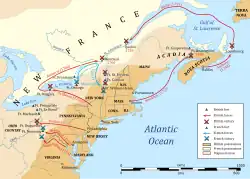 Obwohl sich die Briten im Ohio-Gebiet behaupteten und auch die kanadische Akadien-Provinz rasch einnehmen konnten, erlitt die britische Seite in den ersten Kriegsjahren eine Reihe von Rückschlägen. 1756 gelang den Franzosen die Einnahme von Fort Oswego am Ontariosee. 1757 kulminierte der Grenzkrieg im nordöstlichen New York anlässlich der Geschehnisse während und nach der Belagerung von Fort William Henry. Nachdem die britische Besatzung unter George Munro kapituliert hatte, überfielen indianische Verbündete der Franzosen die abziehenden britischen Truppen und töteten zwischen 70 und 180 von ihnen.[72] Die Kriegswende für die Briten erfolgte erst, nachdem William Pitt ab 1757 als entscheidender Akteur die britische Kriegspolitik bestimmte.[73] Militärisch konzentrierten die Briten ihre Kräfte nun vor allem auf das Sankt-Lorenz-Tal. Erster Schritt war die Unterbrechung der Verbindung zwischen der dortigen Kernkolonie der Franzosen und den westlichen Gebieten. 1759 erfolgte die Einnahme von Québec – ein Unternehmen, bei dessen Entscheidungsschlacht auf der Abraham-Ebene sowohl der britische Oberbefehlshaber Wolfe als auch sein französischer Kontrahent Montcalm fielen.[68] 1760 führten Kolonisten und britische Armee einen Zangenangriff auf Montreal durch und zwangen den französischen Gouverneur schließlich zur Übergabe von Neufrankreich.[67]
