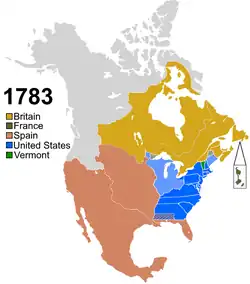 Die ab 1782 aufgenommenen Pariser Friedensverhandlungen kamen mit dem Friedensschluss vom 3. September 1783 zum Abschluss. Neben der Unabhängigkeit der Dreizehn Kolonien brachten sie als Ergebnis neue Grenzfestlegungen. Im Westen bildete der Mississippi nunmehr die offizielle Westgrenze der USA. Die Grenze zu Kanada im Norden blieb so, wie sie war. Als Grenze zum (nunmehr spanischen) Florida wurde der 31. Breitengrad festgelegt. Die alten Verfassungen aus der Kolonialära wurden zwischen 1776 und 1800 durch neue Bundesstaats-Verfassungen ersetzt. Lediglich Rhode Island und Connecticut behielten ihre Charters aus der Zeit Karls II. bei.[100] Der Aufbau des neuen US-Staatswesens mündete in eine Umbruchära, die bis weit in die 1790er-Jahre andauerte.[101] Eine Frage, die sich nach Ende des Unabhängigkeitskriegs stellte, war die Behandlung der Loyalisten. Heutige Zahlen gehen von rund 100.000 Personen aus, welche die USA nach Kriegsende verließen.[102] Über längere Zeit gesehen gelang der Republik allerdings, das Gros der ehemaligen Loyalisten wieder einzugliedern.[103] Im Alten Nordwesten in den heutigen Bundesstaaten Ohio und Indiana hingegen mündete der Unabhängigkeitskrieg in eine Serie von Indianerkriegen, die bis weit in die 1790er-Jahre hinein andauerten und den neuen US-Präsidenten George Washington zur Gründung der Legion of United States veranlassten – dem ersten stehenden Heer des neu gegründeten Staates.[104]