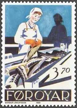 Mit dem Wirtschaftsboom der 1980er Jahre wurde auch Umweltverschmutzung erstmals ein Thema auf den Färöern. Als Fischereination sind sie besonders auf die Reinhaltung der Meere angewiesen. Diese Briefmarke von Bárður Jákupsson 1986 zeigt die Nahrungskette von Fischen, über Tintenfische hin zum Grindwal, der traditionell eine subsistenzwirtschaftliche Nahrungsergänzung der Färinger ist, die am Ende dieser Kette stehen.