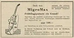 Um die Migros einer noch breiteren Öffentlichkeit bekannt zu machen, ging Duttweiler dazu über, längere Artikel zu schreiben, die ab 17. Dezember 1927 wöchentlich in Form halbseitiger Inserate in bis zu 30 Zeitungen erschienen und Werbung mit Konsumpolitik vermischten. Die erste Ausgabe hiess noch Migros Nachrichten, alle weiteren Zeitung in der Zeitung.[169] Zu Beginn wusste die Öffentlichkeit nicht, wer sie überhaupt schrieb. Erst in der 140. Ausgabe gab sich Duttweiler als Autor zu erkennen.[170] Als einzelne Verlage dem Druck der Migros-Gegner nachgaben und die Inserate nicht mehr annahmen, wehrte sich Duttweiler, indem er die abgesprungenen Zeitungen jeweils prominent erwähnte und so den Ärger der treuen Leserschaft auf die Verlage lenkte. Andere Verlage schlossen Kompromisse und verweigerten die Zeitung in der Zeitung nur dann, wenn sie Angriffe auf inserierende Firmen enthielt.[171] Mit Duttweilers Tod wurde das Erscheinen vorübergehend eingestellt. Nach einer vierjährigen Pause erschienen die Artikel ab 1966 wieder regelmässig.[172] Die Migros stellte am 2. März 1996 das Erscheinen der Zeitung in der Zeitung endgültig ein.[173]