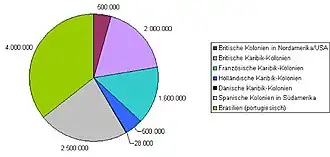 Nahezu alle bedeutenden europäischen Seefahrer- und Handelsnationen – besonders Portugal, Spanien, Frankreich, England, Dänemark und die Niederlande – waren zeitweilig am internationalen Sklavenhandel beteiligt. Die Mehrzahl der Sklaven, mit denen diese Kaufleute handelten, gelangte jedoch nicht ins jeweilige Mutterland, sondern in überseeische Kolonien. Die entsprechenden Seefahrten wurden von europäischen Handelskompanien durchgeführt. Im Zeitraum von 1500 bis 1870 wurden nach Europa 200.000 afrikanische Sklaven eingeführt.[52]