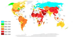 Obwohl das Freilassen von Sklaven als heilbringend gilt, verzögerten die Gebiete im Geltungsbereich des Islam mit am längsten die gesetzliche Abschaffung der Sklaverei. Als letztes Land der Erde schaffte Mauretanien im Jahre 1980 die Sklaverei ab, Sklaven stellen aber nach wie vor die verschwiegene unterste gesellschaftliche Schicht dar.[41] Damit dauert seit dem siebenten Jahrhundert eine Tradition fort, deren deutlichste Spuren bis zum Ende des 19. Jahrhunderts mit Karawanen durch die Sahara in verschiedene arabische Städte am Mittelmeer oder zu den Hafenorten Ostafrikas am Roten Meer und am Indischen Ozean führten.[42]