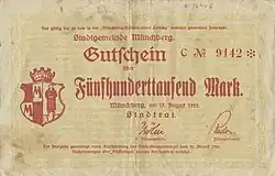 Auf die schwierige wirtschaftliche Lage reagierte besonders die Textilindustrie bald mit Entlassungen. Die Preise stiegen durch die Hyperinflation enorm an. Kostete ein Brot im Oktober 1922 noch 14 Reichsmark, waren es im Februar 1923 1400, im August 200.000 und im Oktober 680 Millionen. Das Bezirksamt Münchberg ermahnte die Landwirte, ihre Lebensmittel nicht über den Schwarzmarkt zu verkaufen. Die Stadt vermittelte Arbeitslose als Erntehelfer an die Landwirtschaft. Mehrere Firmen griffen zur Selbsthilfe, indem sie das Geld, das im Umlauf fehlte, durch eigene Gutscheine oder Lohnschecks zu kompensieren versuchten. Zu diesen Firmen gehörten die Aktienfärberei, wenig später die Firma Friedrich Schödel, die Aktiengesellschaft Braunsberg & Co und die Mönchsbräu. Dies bewegte die Stadt Münchberg, eigenes Notgeld zu drucken. Nach der Genehmigung durch das Reichsfinanzministerium wurden am 29. August 1923 20 Milliarden Reichsmark in Scheinen im Wert von 100.000, 200.000, 500.000, 1,2 und 5 Millionen Reichsmark ausgegeben. Das Finanzministerium verbot gleichzeitig die Ausgabe und den Verkehr nicht autorisierten Notgeldes, darunter fielen die Scheine der genannten Firmen, Gutscheine der Städtischen Sparkasse und Schecks der Bayerischen Vereinsbank Münchberg. Die Inflation war damit aber noch lange nicht vorüber: In einer Stadtratssitzung vom 25. Oktober 1923 wurde der Druck höherer Wertstufen beschlossen. Die höchste Wertstufe erreichte den Betrag von 200 Milliarden. Die Einführung der Rentenmark stoppte diese Entwicklung.[40]