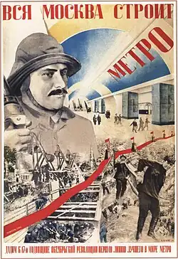 (dt. „Ganz Moskau baut eine U-Bahn“); Plakat von Gustavs Klucis zum Aufruf der Moskauer Bevölkerung zur Beteiligung am Metro-Bau
