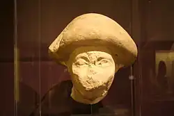 Das größte und berühmteste Fundstück ist ein aus Sandstein gefertigter Kopf einer Sphinx des Radjedef (Louvre E 12626). Er ist 33,5 cm hoch, 28,8 cm breit und 26,5 cm lang. Der König ist mit Nemes-Kopftuch dargestellt. Auf den Augen sind noch die Reste einer schwarzen Bemalung erkennbar, welche die Iris darstellte.[60] Der Louvre beherbergt außerdem den unteren Teil einer Sitzstatue des Radjedef (E 12627).[61] Er misst 28 × 19,5 × 23 cm und nennt den Eigen- sowie den Horusnamen des Königs. Zur Linken des Herrschers ist deutlich kleiner eine kniende Königin dargestellt.