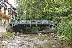 Während des 18. Jahrhunderts entwickelten Hans Ulrich und Johannes Grubenmann einige Innovationen in der Konstruktion von gedeckten Brücken aus Holz.[18] Auf empirische Weise wurden Bogenkonstruktionen mit Spreng- und Hängewerk kombiniert, so dass Brücken mit Spannweiten bis zu sechzig Meter erreicht wurden. Diese Technik wurde von den Brüdern Grubenmann dann auch im Bau weitgespannter Kirchendächer eingesetzt. Als bekanntestes Beispiel ihrer Brückenbauwerke gilt die Rheinbrücke Schaffhausen, die 120 m lang war und nur einen Zwischenpfeiler hatte.[19] In Europa bekannt[20] wurde die 1778 von Johann Christian Adam Etzel (1743–1801; Onkel von Gottlieb Christian Eberhard von Etzel) gebaute Neckarbrücke Plochingen mit einer freitragenden Spannweite von 70 Meter,[21] die 1905 völlig intakt der Erweiterung der Bahnhofanlagen weichen musste. Die 1955 original wieder aufgebaute gedeckte Holzbrücke Forbach (Nordschwarzwald) über die Murg, ursprünglich ab 1778 geplant und gebaut von Otto Lindemann, wird mit ihren 38 Metern Spannweite regional als die „längste freitragende, überdachte und aufgrund ihrer Stabilität befahrbare Holzbrücke in Europa“[22] bezeichnet.