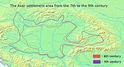 Von 805 bis 828 bestand zwischen Carnuntum und Sabaria (Szombathely) das Awarische Fürstentum. Das Gebiet dieses Vasallenfürstentums breitete sich rund um den Neusiedler See und vermutlich beidseits der Bernsteinstraße aus und war somit etwa durch den Wienerwald im Westen und durch die Raab im Osten und Südosten begrenzt.[18] Es bildete eine militärische Pufferzone zwischen dem Frankenreich und dem Bulgarischen Reich. Eine Klimaverschlechterung, die für das Jahr 822 belegt ist,[19] sowie die politische Schwächung durch Kriege, Waffenembargo und Verlust ihrer sakralen Tradition durch die Annahme des Christentums setzte um 828 dem politischen Einfluss der Awaren endgültig ein Ende.[20] Die Gräber der awarenzeitlichen Siedlung von Zillingtal wurden bis in die Zeit des Awarischen Fürstentums belegt.[21][22] In die Zeit des awarischen Fürstentums fällt die erste urkundliche Erwähnung eines Teils des Burgenlandes. 808 schenkten die Brüder Wirut, Gisalmar und Wentilmar dem Regensburger Kloster Sankt Emmeram das Gebiet „Wolfsbach“, das sich wahrscheinlich in der Gegend des heutigen Mattersburg befand.[23]