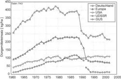 Zunehmender Wohlstand führte zu einer Veränderung der Ernährungsgewohnheiten und seit etwa 2013 wieder zu einem steigenden Düngemitteleinsatz.[15] Heutzutage werden auch künstliche neuronale Netze eingesetzt, um die Auswirkungen von Düngung vorherzusagen und Düngungsempfehlungen abzugeben, insbesondere Convolutional Neural Networks (CNNs)[16][17] und Long short-term memory (LSTM).[18][19]