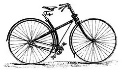 Den Durchbruch des kettengetriebenen Hinterrads erzielte erst John Kemp Starley, Neffe von James Starley, der in Coventry zusammen mit seinem Geschäftspartner William Sutton zunächst Dreiräder produzierte.[58] 1884 entwickelte Starley unter dem Markennamen Rover („Wanderer“) sein erstes Zweirad mit Kettenantrieb auf das Hinterrad, indirekter Lenkung und Klotzbremse auf das Vorderrad. Wie Lawsons Konstruktion hatte es noch unterschiedlich große Räder: 32 Zoll am Vorderrad, 30 Zoll am Hinterrad. Mit einem Gewicht von 37 Pfund (16,7 kg) war der Rover kaum schwerer als heutige Tourenräder.[59] Die Öffentlichkeit war so auf das Hochrad fixiert, dass Besucher der Erstvorstellung das Rover als unsportlich bezeichneten. Starley organisierte daraufhin am 26. September 1885 ein Rennen, auf dem mit einem neuen, deutlich verbesserten Gefährt, dem Rover II, die Schnelligkeit seines Fahrzeugs bewiesen wurde. George Smith gewann das 100-Meilen-Rennen auf dem Rover II (33 Pfund leicht) in 7 Stunden, 5 Minuten und 16 Sekunden.[60][61] 1886 produzierte Starley den Rover III mit Nackensteuerung, der als Prototyp des modernen Fahrrades gilt.[62][63] 1889 erschien das Modell „Ladies Rover“, ein Rad mit tiefem Durchstieg; damit konnten auch Frauen am Fahrradfahren teilnehmen.