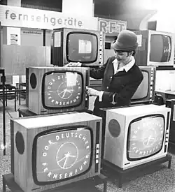 Am 25. Dezember 1952 wurde der offizielle Sendebetrieb mit dem NWDR-Fernsehen wieder aufgenommen. Versuchsprogramme gab es ab Mitte 1950, das erste regelmäßige Nachkriegs-Fernsehprogramm überhaupt wurde im Herbst 1951 vom Werkssender der Firma Grundig in Fürth gesendet.[10] Die Popularität des Fernsehens stieg mit Ereignissen wie der Krönung von Elisabeth II. am 2. Juni 1953 und der Fußball-Weltmeisterschaft 1954 in der Schweiz stark an. Die Sender der ARD hatten eigene und gemeinsame Sendungsanteile in einem kurzen Abendprogramm. Mit der ARD-Sendereihe Wie ich angefangen habe wurden in den Jahren 1957 bis 1958 bekannte Persönlichkeiten zu ihrem Werdegang interviewt; dazu gehörten Alfred Braun, Ernst Deutsch, Paul Löbe, Tilla Durieux, Max von Laue und Hugo Hartung.[11]