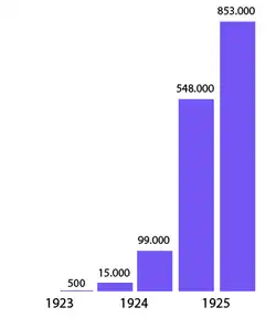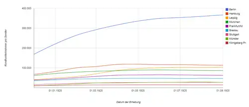 Die Teilnehmerzahlen stiegen erst deutlich, nachdem am 14. Mai 1924 die Jahresgebühr rückwirkend zum 1. April auf 24 Rentenmark festgelegt worden war. Am 1. Januar 1924 gab es in Deutschland 1580 Rundfunkteilnehmer.[24] Zum Jahresende hatten sich 548.749 Teilnehmer angemeldet, ein Jahr später war die Millionengrenze überschritten. Aus dem Verkauf von Radiobauteilen lässt sich jedoch schließen, dass immer noch die meisten Menschen ihren Radioempfänger selbst bastelten und nicht anmeldeten.