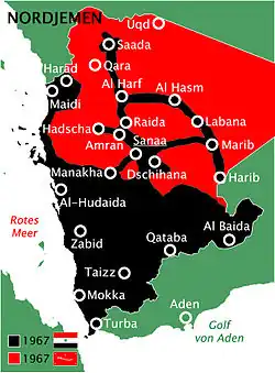 Im Nordwesten machten in den späten 1840er Jahren Stammesführer aus dem jemenitischen Hochland und dem ʿAsīr den qāsimidischen Imamen die Herrschaft streitig.[9] Der dort bestehende kriegsähnliche Zustand führte 1869 zur osmanischen Neubesetzung des Landes. Die zaiditischen Imame konnten jedoch, ausgehend von ihren Kerngebieten im Norden Jemens, ihre Macht zum Teil wiederherstellen und unternahmen 1891–1892, 1898–1899, 1904–1907 und 1910–1911 großangelegte Aufstände gegen die osmanische Herrschaft.[10] Am 30. Oktober 1918 erklärte Imam Yahya Muhammad Hamid ad-Din die formelle Unabhängigkeit des Jemen vom Osmanischen Reich, im Jahr 1926 rief er sich zum König von Jemen aus. Das hiermit begründete Königreich Jemen bestand bis 1962 weiter. Von 1958 bis 1961 schloss es sich den Vereinigten Arabischen Staaten an. Schon unter Yahya Muhammad kam es aber zur Auflehnung der nordjemenitischen Stämme gegen die Zentralherrschaft, die sich unter seinem Nachfolger Ahmad ibn Yahya verschärften.