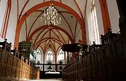 Weithin sichtbar prägt der Hochchor der Norder Ludgeri-Kirche den größten Sakralbau in Ostfriesland, der als dreischiffiger Kathedralbau ausgeführt ist. Nach Einsturz des romanischen Querhauses um 1445 wurde ein neues im gotischen Stil aufgeführt. Zeitgleich entstand der Chor, der mit 21 Metern Scheitelhöhe den übrigen Baukörper überragt. Ein gewölbter Chorumgang umgibt das aufstrebende Mittelschiff, das in drei Zonen mit profilierten Spitzbögen gegliedert ist: unten Bögen zwischen Hochchor und Umgang, in der Mitte Blendnischen und als Abschluss die Obergadenfenster mit schrägen Laibungen. Das Rippengewölbe ruht auf 13 Rundpfeilern, über deren Kapitellen die birnstabförmigen Gewölberippen ansetzen, die schließlich in Schlusssteine ausmünden.[52]