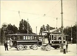 Weitere technische Neuerungen waren die Verwendung von Vollgummireifen statt eisenbereifter Holzspeichenräder. Darüber hinaus stand – erstmals im regelmäßigen Fahrgastbetrieb – bei zwei der Mercédès-Électrique-Stoll-Anlagen jeder Fahrtrichtung ein Fahrleitungspaar zur Verfügung, von Stoll als Vierdrahtsystem bezeichnet. Die Bauart Mercédès-Électrique-Stoll war vergleichsweise stark verbreitet, es bestanden insgesamt 18 Anlagen nach diesem System.[27] Eine 1912 geplante Strecke in München, sie sollte von Neuhausen nach Sendling führen, konnte hingegen nicht mehr verwirklicht werden:[4]