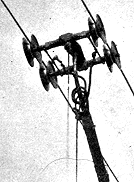 „Another arrangement by which an ordinary omnibus might be run upon the street would have a suspender thrown at intervals from one side of the street to the other, and two wires hanging from these suspenders; allowing contact-rollers to run on these two wires, the current could be conveyed to the tram-car, and back again to the dynamo machine at the station, without the necessity of running upon rails at all.“