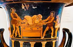 Griechische Phlyakenvase mit einer Szene aus einer Theater-Komödie: Der paestanische rotfigurige Kelchkrater des Vasenmalers Asteas zeigt die drei Männer Gynmilos, Kosios und Karion, wie sie den Geizhals Kharinos innerhalb seines Hauses berauben.