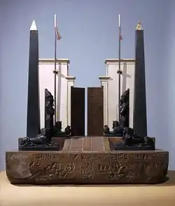 Ramses I. begründete die 19. Dynastie und baute in Heliopolis ein Sonnenheiligtum. Davon zeugen heute allerdings nur noch Fragmente zweier kleiner Obelisken. Das erste Stück in Kopenhagen besitzt eine Höhe von 105 cm und das zweite in Avignon eine Höhe von 94 cm.[24] Von seinem Sohn Sethos I. haben sich mehrere Objekte erhalten. Hierbei handelt es sich u. a. um einen 23 Meter hohen Obelisken, der heute auf der Piazza del Popolo in Rom steht, und um ein Tempelmodell. Durch dieses Miniaturmodell mit Eintiefungen für Sphingen, Obelisken und Tempelmauern lässt sich ein vollkommen zerstörter Tempelabschnitt Sethos’ I. rekonstruieren. Vor dem Tempeleingang standen auf beiden Seiten jeweils ein Obelisk und eine Sphinx.[25]