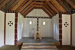 Neben diesem Gebäude befindet sich eine Stabkirche aus dem 11. Jahrhundert, welche eine Rekonstruktion einer ausgegrabenen Kirche aus Kleinlangheim im Landkreis Kitzingen darstellt. Diese Kirchen dienten der Slawenmission. Vorbild für den bemerkenswerten Dachstuhl ist eine flüchtige Skizze, die ein Mönch am Rande seines Gebetbuches hinterlassen hat.