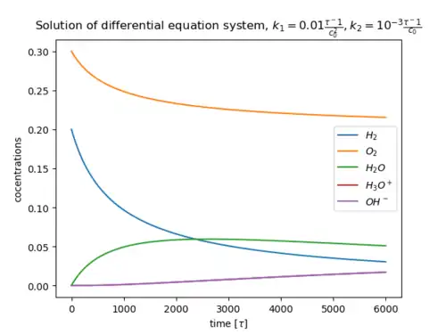 Als Beispiel für ein System aus Differentialgleichungen, die jeweils Geschwindigkeitsgesetze von Elementarreaktionen sind und die für die Kinetik einer Gesamtreaktion relevant sind, wird die Oxidation von Wasserstoff herangezogen: