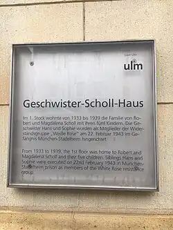 Ebenfalls 2005 wurde eine privat initiierte Gedenktafel für Hans und Sophie Scholl am Wohnhaus der Familie Scholl in den Jahren 1930–1932 in Ludwigsburg angebracht und in Gegenwart von Elisabeth Hartnagel geb. Scholl eingeweiht. Die Tafel befindet sich am Eckhaus Schillerplatz 7/Myliusstraße.[9]