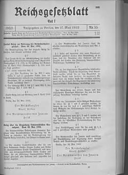 Entsprechende Bestimmungen enthielt das Gesetz über die Einziehung volks- und staatsfeindlichen Vermögens vom 14. Juli 1933. Danach wurden „Sachen und Rechte der Sozialdemokratischen Partei Deutschlands und ihrer Hilfs- und Ersatzorganisationen sowie auf Sachen und Rechte, die zur Förderung marxistischer oder anderer, nach Feststellung des Reichsministers des Innern volks- und staatsfeindlicher Bestrebungen gebraucht oder bestimmt sind,“ ebenfalls eingezogen.