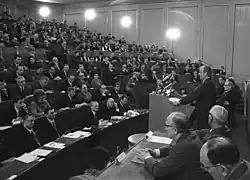 Der Entwurf des Gesetzes über die Unterbrechung der Schwangerschaft entstand in gemeinsamen Beratungen des Verfassungs- und Rechtsausschusses, des Ausschusses für Gesundheitswesen und des Ausschusses für Arbeit und Sozialpolitik der Volkskammer.[24] Bei der Abstimmung in der Volkskammer am 9. März 1972, die durch Handzeichen erfolgte,[25] kam es nach Redebeiträgen des Volkskammerpräsidenten Gerald Götting, des Ministers für Gesundheitswesen Ludwig Mecklinger und der Abgeordneten Hildegard Heine vom Ausschuss für Gesundheitswesen zum ersten und einzigen Mal vor der politischen Wende von 1989 zu einem nicht einstimmigen Ergebnis; 14 Abgeordnete der Christlich-Demokratischen Union Deutschlands – rund ein Viertel der Fraktionsmitglieder – stimmten gegen das Gesetz und acht Abgeordnete enthielten sich der Stimme.[26] Der Anteil der Gegenstimmen an der Gesamtzahl der Abgeordneten in der Volkskammer, die über eine Einheitsliste der Nationalen Front mit feststehender Sitzverteilung gewählt wurde, lag bei weniger als drei Prozent. Die uneinheitlichen Meinungen innerhalb der CDU zum Gesetzesvorhaben sowie das geplante abweichende Stimmverhalten der betreffenden Abgeordneten waren der Führung der Partei um ihren Vorsitzenden Gerald Götting im Vorfeld bekannt und über Albert Norden, Mitglied im Politbüro des Zentralkomitees der SED, rund einen Monat vor der Beschlussfassung der SED-Führung mitgeteilt worden.[27][28] Dementsprechend ging Gesundheitsminister Ludwig Mecklinger, Mitglied der SED, in seinen Ausführungen zur Begründung des Gesetzes auch auf die Bedenken in kirchlichen Kreisen ein.[27]