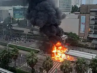 - ↑ a b Liputan6.com: Tinjau Halte Bundaran HI yang Terbakar, Anies: Segera Diperbaiki. 8. Oktober 2020, abgerufen am 8. Oktober 2020 (indonesisch).