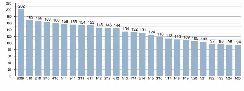 | Jahr | 1970 | 1980 | 1990 | 1995 | 2000 | 2005 | 2010 | 2015 | 2016 | 2017 | 2018 | 2019 | 2020 | 2021 | 2022 | 2023 | 2024 | 2025 |