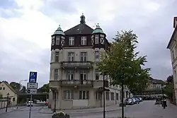 Das Haus Gesundbrunnenstraße 1; links befindet sich die Königstraße, rechts die Gesundbrunnenstraße. Im Hintergrund links und rechts die Brücke der Bundesstraße 158.