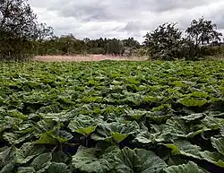 Das Laubblatt ist in Blattstiel und -spreite gegliedert. Die innen hohlen Blattstiele sind rund und seitlich deutlich gerippt, auf der Oberseite tief sowie scharfkantig gefurcht.[1] Die einfache Blattspreite ist bei einer Breite von bis zu 60 oder 90 Zentimetern rundlich, breit herz- oder nierenförmig.[1] Die untersten Seitennerven verlaufen am Rand der Stielbucht und begrenzen diese. Die Blattunterseite ist grau-grün sowie nur schwach grau wollig behaart und später verkahlend.[1] Der Blattrand ist regelmäßig und scharf ausgebissen gezähnelt.[3]