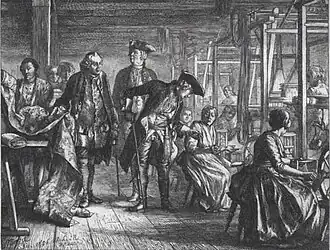 Nach Beendigung des Ersten und Zweiten Schlesischen Krieges wandte sich Friedrich II. intensiv dem Auf- und Ausbau der heimischen Manufakturen zu. Noch bei seinem Regierungsantritt war das gesamte Preußen vorwiegend agrarisch geprägt und verfügte nur über einen geringen Exportanteil an weiterverarbeiteten Gütern. Die Einflussnahme des Königs zielte auf die Erlangung einer positiven Handelsbilanz und die Steigerung der finanziellen Staatsreserven. Gleichzeitig wollte er einen von ausländischen Importen autarken preußischen Markt schaffen, um den Abfluss von Devisen ins Ausland zu verhindern. Der Ausbau des Textilgewerbes sollte weiter forciert werden um den Bedarf für die heimische Zivilbevölkerung und das Militär zu decken. Um den eigenen Wünschen nach hochwertigen Geweben für die Ausstattung der Schlösser und Herrenhäuser nachzukommen, richtete der König seine wirtschaftspolitischen Bemühungen auch auf das Seidengewerbe, das zu einem wirtschaftspolitischen Lieblingsprojekt Friedrichs II. wurde. Diese erhielt einen hohen Anteil von staatlichen Unterstützungsgeldern, Konzessionen, Privilegien und die Bereitstellung von Gebäuden und Fabrikationsmitteln. Für den erfolgreichen Anbau von Maulbeerbäumen zur Seidenraupenzucht setzte er staatliche Prämien aus, um die in Potsdam und Berlin zu etablierenden Manufakturen mit einheimischer Landsiedel zu versorgen. Zusätzlich wurden Facharbeiter und Seidenweber aus Frankreich angeworben. Die Seidenindustrie, deren Produkte wie Damast, Atlas, Brokat, Gros de Tours ein „hofnahes“ Kunstprodukt darstellte und von einer kontinuierlichen staatlichen Schutzpolitik abhängig war, erreichte 1780 ihre maximale Produktion und ging danach zurück. Die Seidenherstellung in Brandenburg konkurrierte mit dem führenden französischen Vorbild und gelangte zu künstlerischer Eigenständigkeit. Ein bedeutender märkischer Unternehmer in diesem Segment wurde Johann Ernst Gotzkowsky aber auch der Berliner Posamentier und Hoflieferant Christian Friedrich Blume (1693–1746) und der Schutzjude David Hirsch. Karl David Kircheisen sorgte auf staatlicher Seite für die entsprechende Industrieförderung von 1742 bis 1770.[15] 1758 war im Schloss Glienicke die Tapetenmanufaktur des jüdischen Unternehmers Isaac Levin Joel eingerichtet worden, der dort Wachstuchtapeten produzierte. Dessen Manufaktur wurde zu einer der erfolgreichsten in ganz Preußen. Seine Tapeten dekorierten die Häuser vieler Adeliger aber auch die Schlösser des Königs.[16] Die Gewebe einheimischer Manufakturen erreichten eine hohe Qualität in Entwurf und Ausführung. Die höfische Nachfrage nach Luxuserzeugnissen bewirkte eine Stimulation im Gewerbesektor und die Schaffung eines High-End Sektors, der für eine kleine zahlungskräftige Kundschaft produzierte. Letztlich arbeiteten im gewerblichen Bereich die Mehrzahl der Schaffenden auf handwerklicher Basis, das heißt nicht auf standardisierte Massenproduktion ausgerichtete Unternehmen mit eher kleinem Zuschnitt.