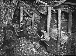 Für die Gewinnung mineralischer Rohstoffe werden verschiedene Techniken, Werkzeuge und Betriebsmittel benötigt.[4] Sämtliche bergmännische Arbeit für das Gewinnen der Rohstoffe wird als Gewinnungsarbeit bezeichnet.[5] Dabei dient die Gewinnungsarbeit sowohl der Gewinnung der nutzbaren Mineralien als auch der Hereingewinnung des Nebengesteins.[4] Die Art und Weise, wie die nutzbaren Mineralien und das Nebengestein aus dem Gebirge gelöst werden, bezeichnet man als Gewinnungsverfahren.[6] Bei der Gewinnung können die Lagerstätteninhalte durch den Einsatz mechanischer, chemisch-physikalischer, thermischer und biologisch-chemischer Energie aus dem Verband herausgelöst werden.[7] Unter Berücksichtigung dieser Möglichkeiten, können die Lagerstätteninhalte manuell,[8] konventionell[9] oder mechanisch[4], also maschinell, gewonnen werden.[8] Die mechanische Energie lässt sich im Bergbau auf unterschiedliche Art und Weise, z. B. schneidend oder schlagend nutzen. Bei Sprengstoffen wird die chemisch-physikalische Energie genutzt.[7] Auch die Lösewirkung von Wasser kann ausgenutzt werden.[10] Dabei wird die Lagerstätte unter Zuhilfenahme von biologisch-chemischer Energie in situ ausgelaugt.[7] In Salzlagerstätten wird das Salz oftmals durch Auslaugen von Lagerstättenteilen herausgelöst.[10] Außerdem ist es möglich, die Wirkung des Feuers zu nutzen, um das Gestein aufzulockern oder zu sprengen.[11] Hierbei wird die thermische Energie des Feuers genutzt.[7] Allerdings wird bei diesem Verfahren, das früher im Erzbergbau zur Gewinnung genutzt wurde und als Feuersetzen bezeichnet wurde, das Gestein nur aufgelockert.[12] Das Hereingewinnen des Minerals erfolgte anschließend manuell mittels Schlägel und Eisen.[11] Die Anteile des herausgelösten Minerals, die nicht genutzt werden können oder bei der Förderung verloren gehen, bezeichnet man als Gewinnungsverluste.[1] Der Umfang, mit dem zur Gewinnung Maschinen eingesetzt werden, bezeichnet man als Grad der Mechanisierung.[4] Die bei der Gewinnung eingesetzten Maschinen nennt der Bergmann Gewinnungsmaschinen.[13] Im modernen Steinkohlenbergbau werden Kohlenhobel und Walzenschrämlader als Gewinnungsmaschinen eingesetzt. Im Salz- und Kalibergbau kommen Umfangfräsen wie der Continuous Miner zum Einsatz.[9] Wie und in welchem Umfang bei der Gewinnung Maschinen eingesetzt werden, hängt zum einen vom Stand der Technik, zum anderen von der Beschaffenheit der Lagerstätte ab.[4] Die Beschaffenheit der Lagerstätte hat einen großen Einfluss auf die Gewinnbarkeit der Mineralien.[14]