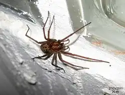Als „Winkelspinnen“ werden verschiedene Arten der Gattungen Eratigena und Tegenaria aus der Familie der Trichterspinnen (Agelenidae) bezeichnet, von denen einige auch als „Hausspinnen“ vermehrt im Siedlungsbereich vorkommen. Ein prominentes Beispiel ist die Große Winkelspinne (Eratigena atrica, Syn.: Tegenaria atrica), die, wie einige verwandte und sehr ähnliche Arten, zu den häufigsten synanthropen, in Häusern lebenden Spinnen Mitteleuropas zählt. Sie kommt wohl in den Kellern fast aller älteren Häuser vor, meidet aber Behausungen aller Art nicht. Die Weibchen erreichen etwa 18, Männchen nur 15 Millimeter Körperlänge, damit gehört sie zu den größten Spinnen der Region. Die langbeinige, stark behaart wirkende Spinne ist braun gefärbt mit einer dunklen Zeichnung, auf dem Vorderkörper zwei unscharf begrenzte Längsbänder, auf dem Hinterleib ein Muster aus Winkelflecken. Die Beine sind einfarbig, nicht wie bei einigen der verwandten Arten geringelt. Die Große Winkelspinne lebt bevorzugt in Häusern, nur selten im Freiland. Sie baut in einem nicht zu trockenen Raum, von einer Spalte oder Ritze ausgehend, ein Trichternetz, das sich innerhalb der Spalte zu einer Wohnröhre verjüngt, in der sie auf Beute lauert. Sie ist nachtaktiv. In der Wohnung nachts herumlaufende Tiere fangen sich nicht selten in Waschbecken oder Badewannen, deren glatte Wände sie zur Falle für die Tiere machen.[28]