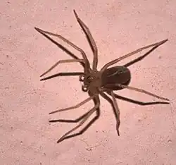 Im englischen Sprachgebrauch sind die Einsiedler-Violinspinnen (Loxosceles) ähnlich der deutschen Trivialbezeichnung als „Recluse spiders“ (übersetzt „Einsiedlerspinnen“) bekannt. Die artenreiche Gattung umfasst etwa 140 Arten[16], mit weltweiter Verbreitung in den Tropen und Subtropen, mit Verbreitungsschwerpunkt in der Neuen Welt. Wenige Arten dringen bis in die gemäßigten (temperaten) Breiten vor, in Nordamerika besonders Loxosceles reclusa (fünf weitere Arten in den USA sind seltener und nur im Süden verbreitet). Besonders viele Vergiftungsfälle gehen auf die südamerikanische Loxosceles laeta zurück. Arten wie die Braune Violinspinne (Loxosceles rufescens) leben auch im europäischen Mittelmeerraum. Arten der Einsiedler-Violinspinnen sind meist bräunlich gefärbt, bei vielen Arten mit einer violinförmigen dunkleren Zeichnung auf dem Vorderkörper. Die langbeinigen Spinnen besitzen sechs Augen in zwei Reihen.