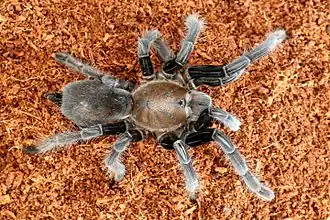 Eine Peru-Blaufuß-Riesenvogelspinne (Pamphobeteus antinous), die sich zuvor durch das „Bombardieren“ mittels der Brennhaare verteidigt hat. Dies macht sich durch die „Glatze“ des noch erhobenen Opisthosomas bemerkbar.