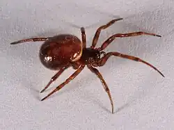 Die ungefährliche Gewöhnliche Fettspinne (S. bipunctata) zählt zur Gattung der Fettspinnen (Steatoda) und ist auch in Deutschland häufig anzutreffen.