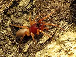Die Familie der Sechsäugigen Sandspinnen (Sicariidae) umfasst die drei Gattungen Hexophthalma, Loxosceles (Einsiedler-Violinspinnen) und Sicarius, die allesamt für wirkungsvolle Gifte bekannt sind. Sechsäugige Sandspinnen gehören zu den Spinnen, bei deren Biss nekrotische Wunden nachgewiesen sind, wobei diese beim Menschen lediglich durch Bisse der Einsiedler-Violinspinnen als überliefert gelten. Allerdings erwiesen sich in vielen Fällen Angaben, eine Nekrose ginge auf einen Spinnenbiss zurück, als falsch. In Australien ist es, trotz zahlreicher Verdachtsfälle, sogar nie gelungen, vorliegende Nekrosen mit Spinnenbissen in Verbindung zu bringen. Bei den lange verdächtigten „White tails“ (der Familie Lamponidae) wurden bei 130 Fällen von Spinnenbissen keinerlei Nekrosen beobachtet.[15]