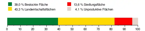 Es besteht zu 39 % aus bestockter Fläche, zu 43,3 % aus Landwirtschaftsfläche, zu 13,6 % aus Siedlungsfläche und zu 4,1 % aus unproduktiven Flächen.