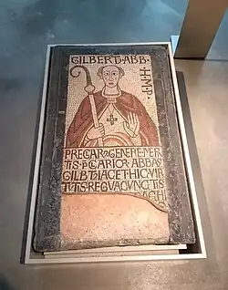 Der Passus „IDIBUS•OCTONIS“ im Römischen Kalender bedeutet den „achten der Iden“ (= der 8. Tag vor den Iden, das ist der 13. der Monate Januar, Februar, Junius, Sextilis (Augustus), September, November, Dezember, also der 6. des Monats), die Sonnenherrschaft im Löwen den „August“. Die Buchstaben „H•M•P“ oben rechts auf dem Mosaik in abwärtiger Schrift können mit der Bedeutung „Hic monumentum posuit“ (hat hier das Grabmal erstellt) darauf hindeuten, dass seine Mönche ihn seiner Zeit in der Krypta der Abteikirche genau unter dem Hochaltar beisetzten. Eine andere Deutung mit dem vorausgehenden Namen und Titel weist auf seine Eigenschaft als erster Abt hin: „GILBERT[US]•ABB•H•M•P•“ = „GILBERT[US] ABB[AS] H[UIUS] M[ONASTERII] P[RIMUS]“: „Gilbert - dieses Klosters erster Abt“.
