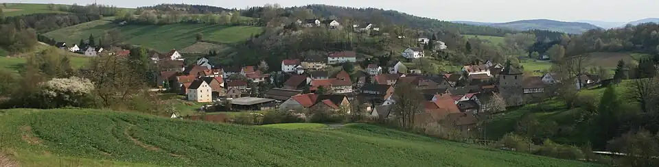 Davor verdeckt Hinterm Stein. Links Simbach. Im oberen Teil Bühl. Rechts Gilfershäuser Kirche. Dahinter verdeckt In den Dellen.