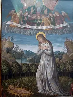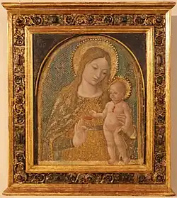 - Thronende Maria mit dem Kinde zwischen zwei Heiligen und einem Stifter.