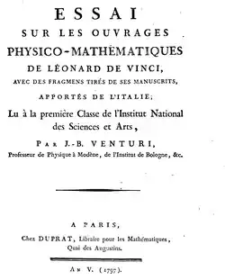 - ↑ Venturi Begins Scientific and Art Historical Studies on Leonardo da Vinci e saggi publicate a Parigi, HistoryofInformation.com, abgerufen am 28. März 2021