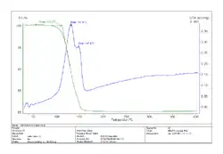 Beim Erhitzen geht das Kristallwasser verloren (TG-Kurve = Masseverlust, onset = Beginn der Wasserabspaltung, Peaks = Maxima der Reaktion), und es entsteht zuerst ein Hemihydrat (auch Halbhydrat, gebrannter Gips bzw. Bassanit genannt) mit der chemischen Formel CaSO4 • ½ H2O, bei weiterem Wasserverlust entsteht schließlich über den löslichen Anhydrit III der unlösliche Anhydrit II (CaSO4), letztere beide werden mineralogisch schlicht Anhydrit genannt.