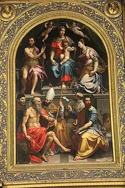 - ↑ Fototeca della Soprintendenza per i beni storici, artistici ed etnoantropologici per le province di Milano, Bergamo, Como, Pavia, Sondrio, Lecco, Lodi e Varese: Siciolante Girolamo da Sermoneta - sec. XVI - Madonna con Bambino in trono con sant'Agnese, sant'Agata, san Paolo, san Bartolomeo, sant'Antonio Abate (?), san Ciriaco (?) e il donatore Giorgio Morato. Europeana, abgerufen am 17. Dezember 2020.